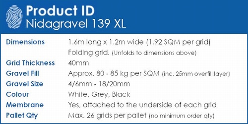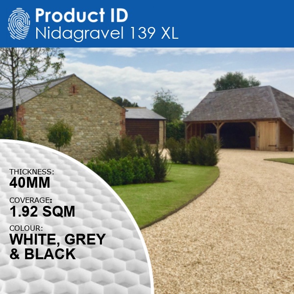 Nidagravel 139 XL is our professional folding gravel grid. 40mm thick and designed for stabilising any size gravel driveway with gravel up to 20mm in size. Permeable, strong and quick to install.